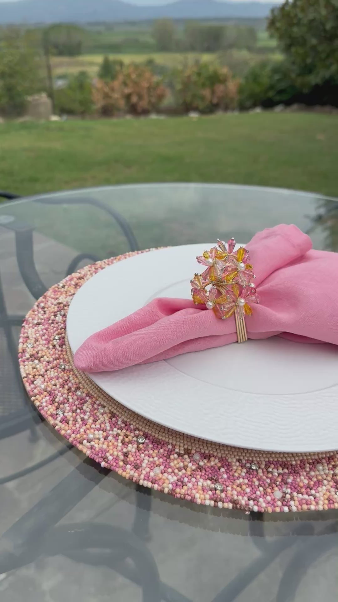 Add a touch of refined elegance to your yacht dining with our Rose Glamour Beaded Placemat. Adorned with delicate pink beads and sparkling rhinestones, this placemat brings subtle glamour and a soft, feminine charm to your table setting.